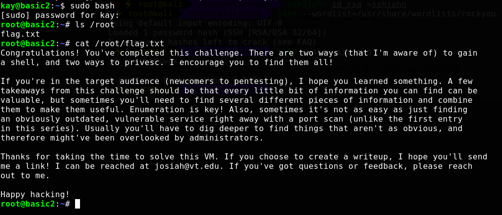 kay@basic2:~$ sudo -l Matching Defaults entries for kay on basic2: env_reset, mail_badpass, secure_path=/usr/local/sbin\:/usr/local/bin\:/usr/sbin\:/usr/bin\:/sbin\:/bin\:/snap/bin