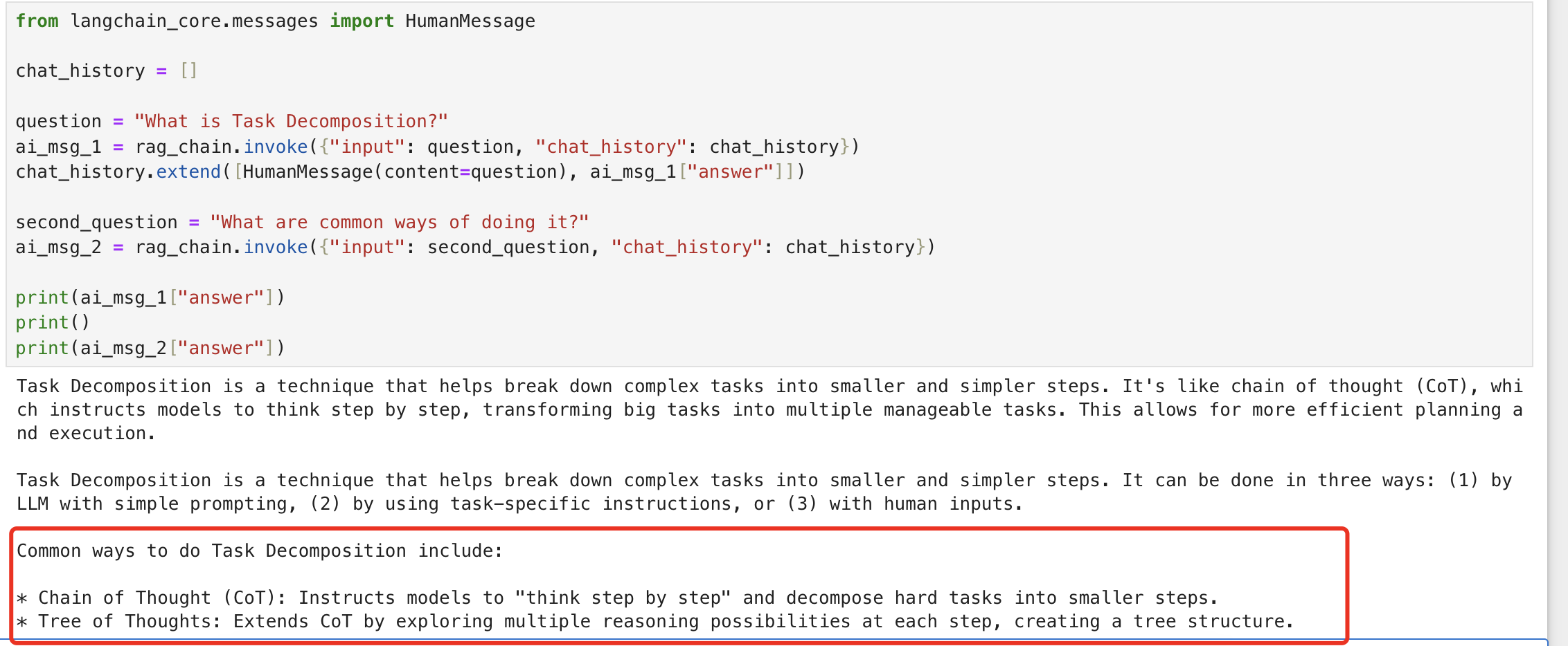 conversational_rag_chain.invoke( {"input": "What are common ways of doing it?"}, config={"configurable": {"session_id": "abc123"}}, )["answer"] # 'Task decomposition can be achieved through various methods, including:\n\n* Chain of Thought (CoT): Instructing the model to "think step by step" to decompose hard tasks into smaller and simpler steps.\n* Behavioral cloning over actions: Using a set of source policies trained for specific tasks to generate learning histories and distill them into a neural network.\n\nI don\'t know about other common ways.'