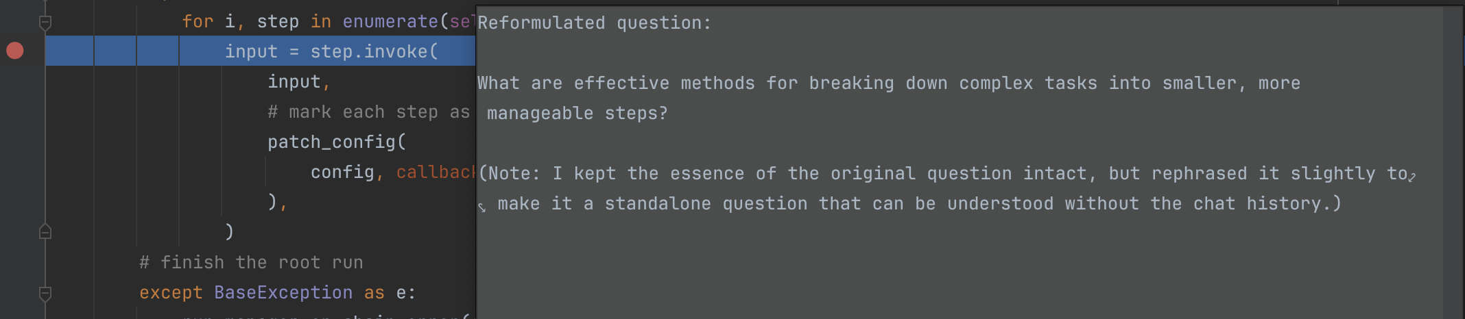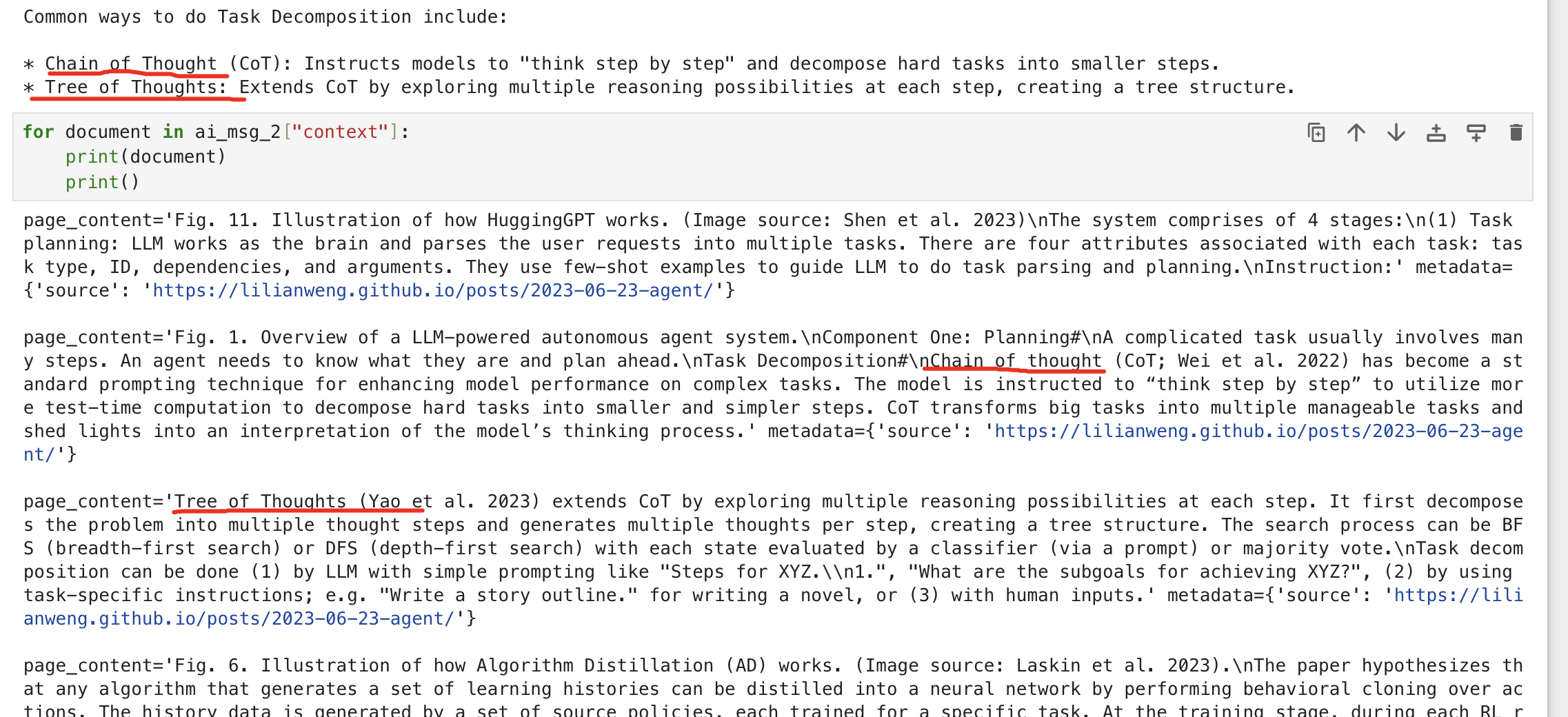 conversational_rag_chain.invoke( {"input": "What is Task Decomposition?"}, config={ "configurable": {"session_id": "abc123"} }, # constructs a key "abc123" in `store`. )["answer"] # "Task decomposition is a technique that breaks down complex tasks into smaller and simpler steps. It involves decomposing big tasks into multiple manageable tasks, making it easier to understand the model's thinking process and interpret the results. This approach is often used in prompting techniques like Chain of Thought (CoT) to enhance model performance on complex tasks."