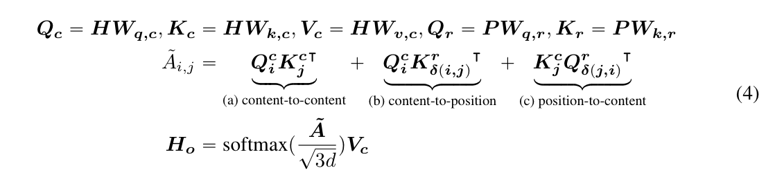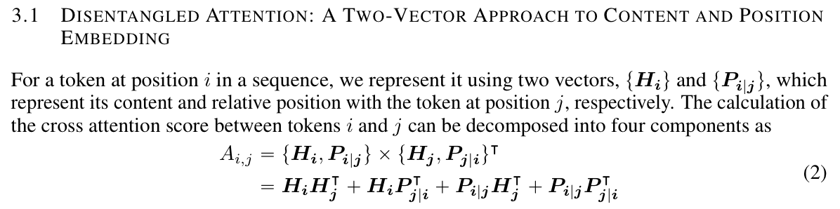 不同于bert一个词只有一个content embedding和一个position embedding, 求和即位词嵌入; DeBERTa中每个词都有两个vector表示,而position embedding也是relative embedding,然后token_i和token_j的cross attention就可以由四个部分组成: content -> content, content -> positon, position -> content, position -> position.