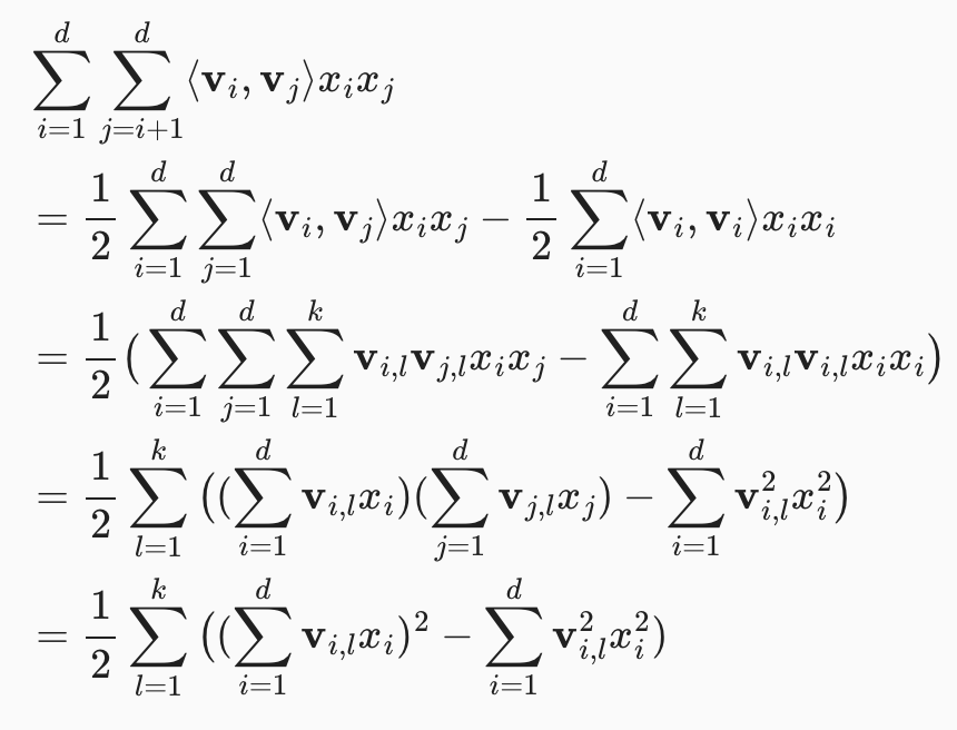 $ p = b + \sum_{i=1}^d w_ix_i + \sum_{i=1}^d\sum_{j=i+1}^d (v_i^Tv_j)x_ix_j$