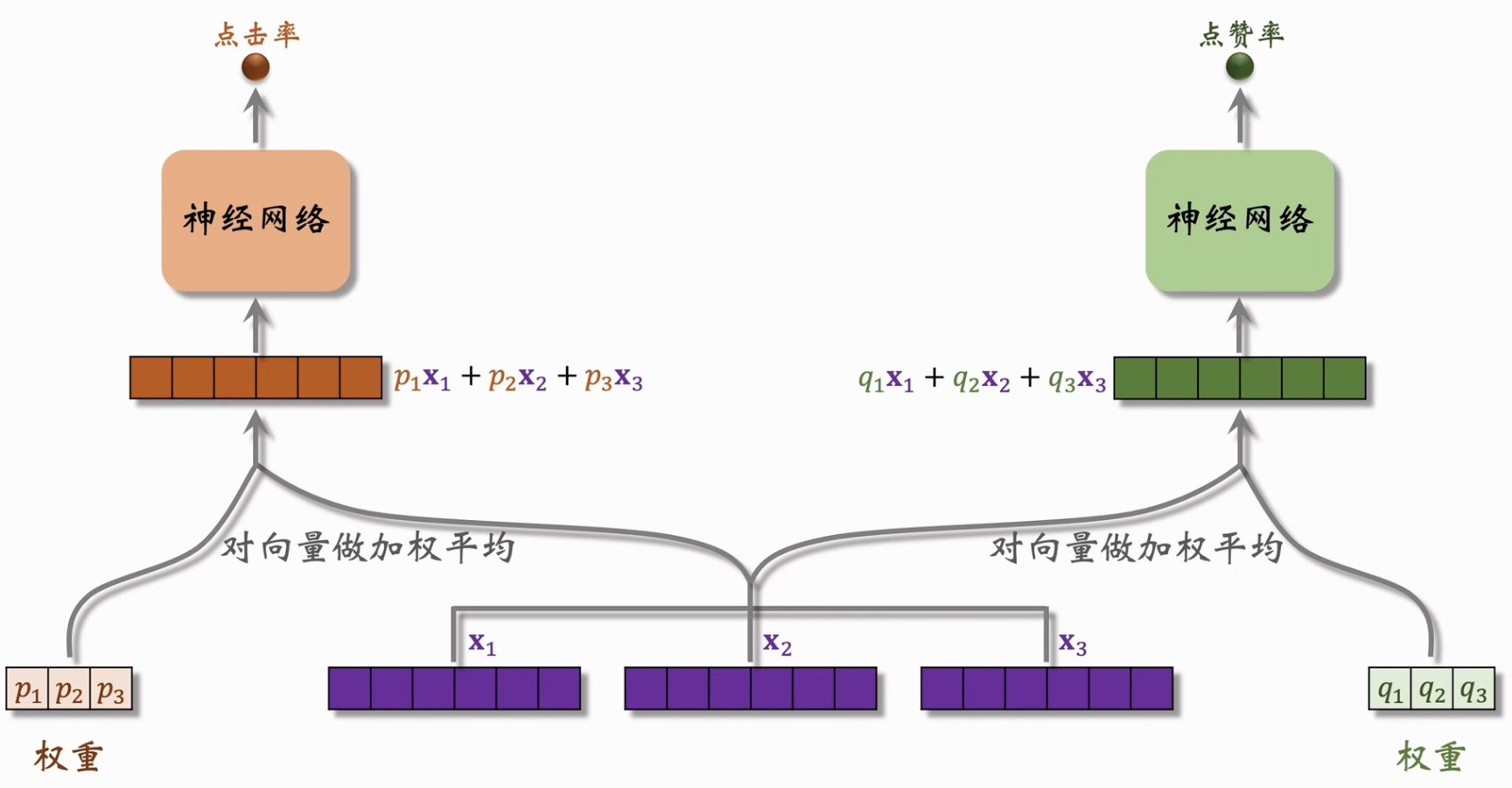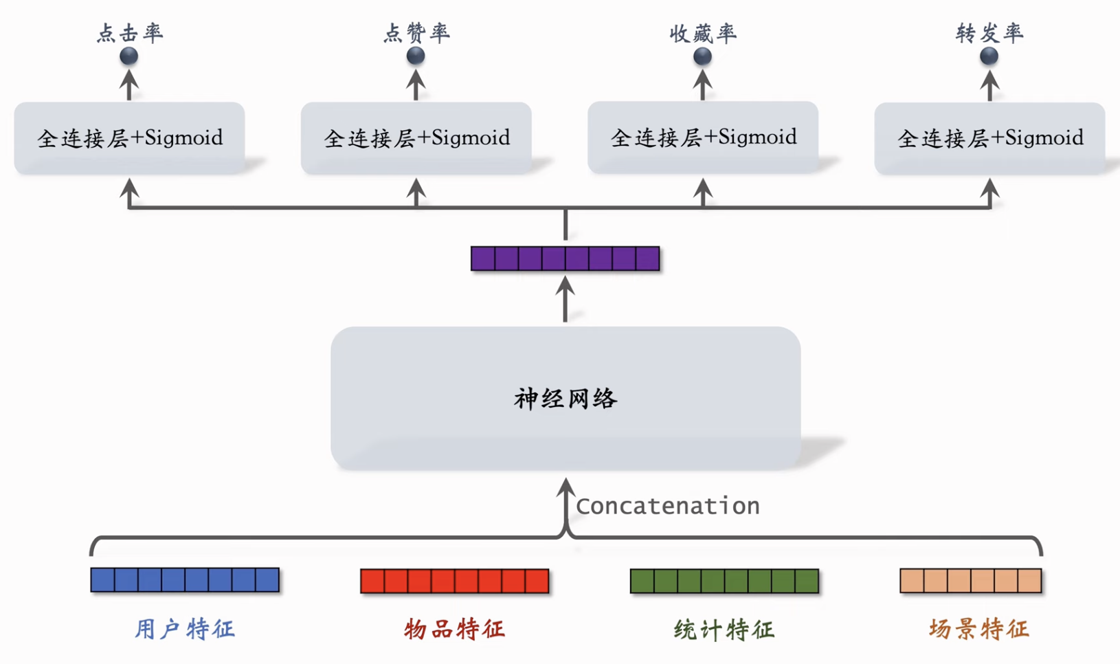 输入用户特征, 物品特征以及统计特征, 模型预测并输出相关指标, 最终我们对输出指标打分, 这个分数就作为最终排序分数.