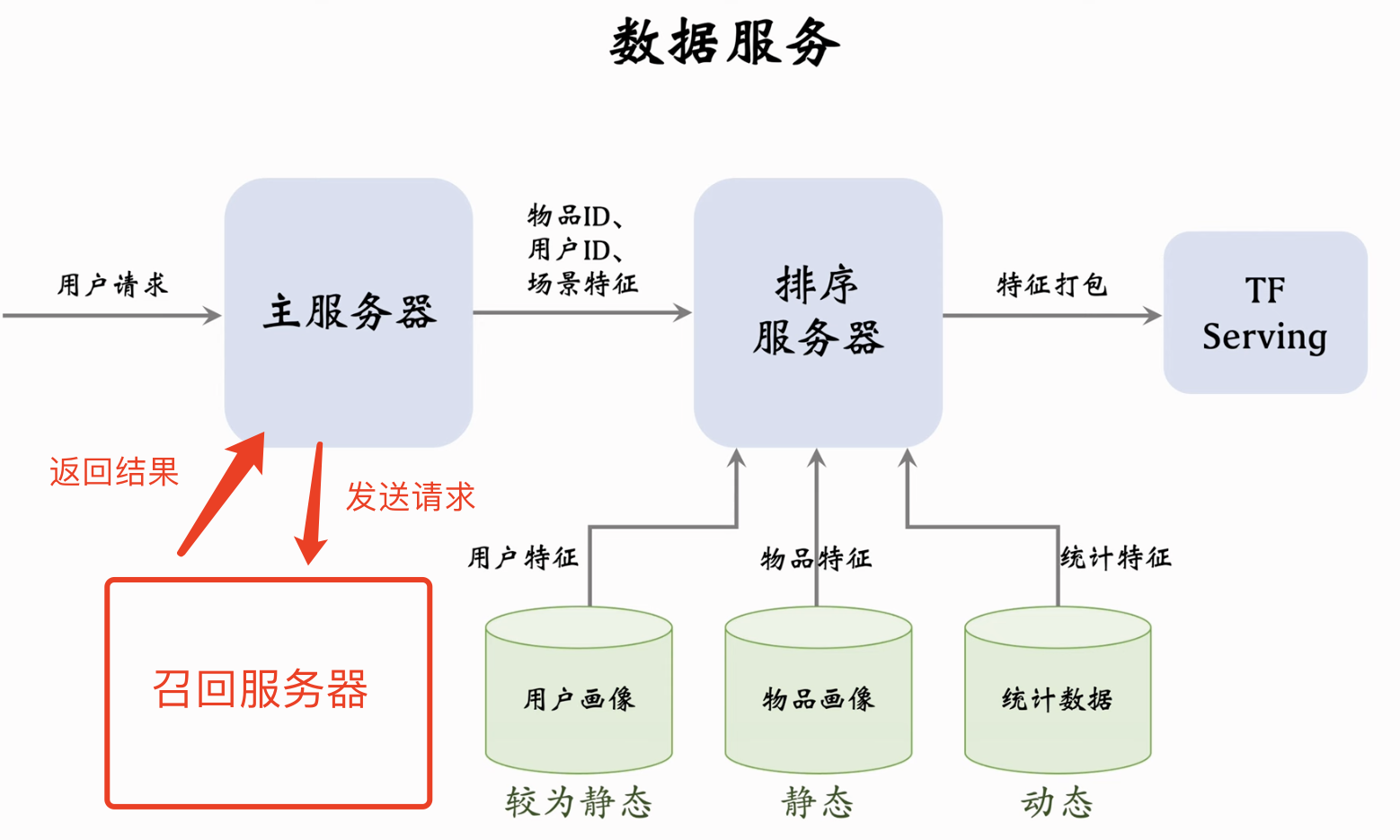 首先用户发送请求, 主服务器接受请求然后转发给召回服务器, 召回服务器多路召回并把结果(召回物品id)返回给主服务器.